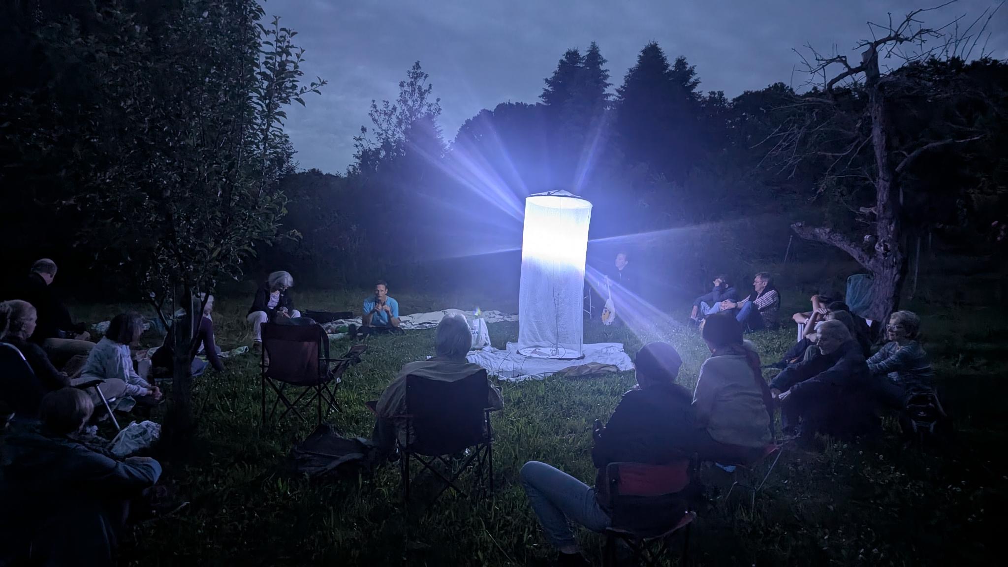 Mit Hilfe zweier UV-Lichtanlagen werden in einem sehr interessanten Gebiet am Waldrand über mehrere Stunden Nachfalter aus einem großen Artenspektrum angelockt. Diese Fläche ist daher sehr interessant, da sie seit ein paar Jahren in ein artenreiches Biotop mit vielen verschiedenen Pionierbaumarten und verschiedenen Wiesentypen umgewandelt wird. Immer wieder kommen neue Arten ans Licht, was die Erfassung um so spannender macht. Das Leuchten ist so wohl für Anfänger zum Kennenlernen der verschiedenen Nachfalter-Familien geeignet als auch für Spezialisten die hier von einer außerordentlichen Vielfalt überrascht werden können. Mitzubringen sind neben Stühlen oder Hockern gerne auch Knabbersachen und was zum Trinken.
